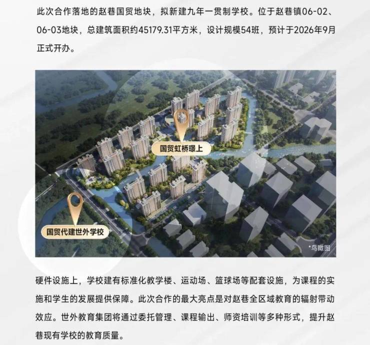 国贸为政府代建两所9年一贯制学校(小学+初中),紧邻项目西侧,一路之隔