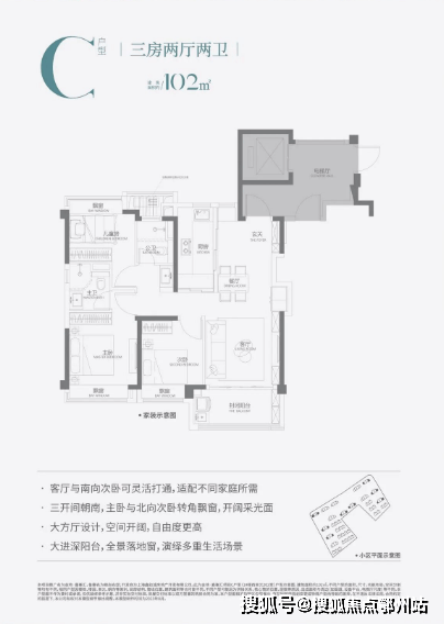 在同步继承百平户型优势的基础上,针对小户型空间有限的客观现实,做出了对应的设计。三分离卫生间,不仅将“一卫”的空间还给了其它房间,更可容纳一家三口分别使用不同功能区,增加空间利用率。三卧室带飘窗,提升使用面积。