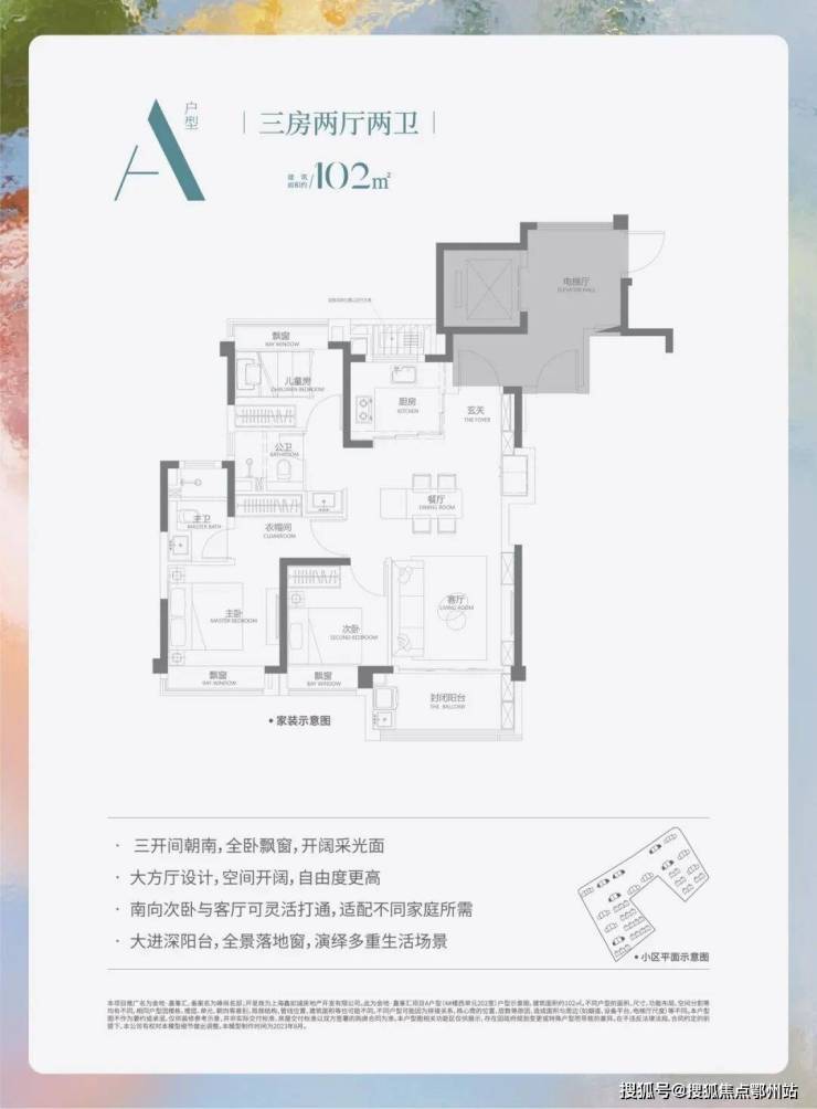 三开间朝南。拥有充分的采光。 主卧及北卧室还带有L型飘窗,大进深阳台全景落地窗,优化采光,提升观景体验。