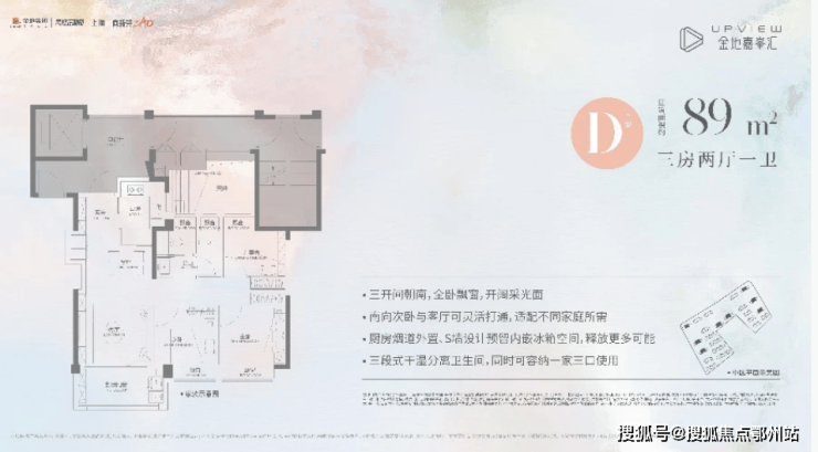 建面约89㎡三房两厅一卫(D户型), 不仅功能完备,而且很好地把控了总价,约350万起即可上车高配品质三房,堪比市场上110平左右的空间感!