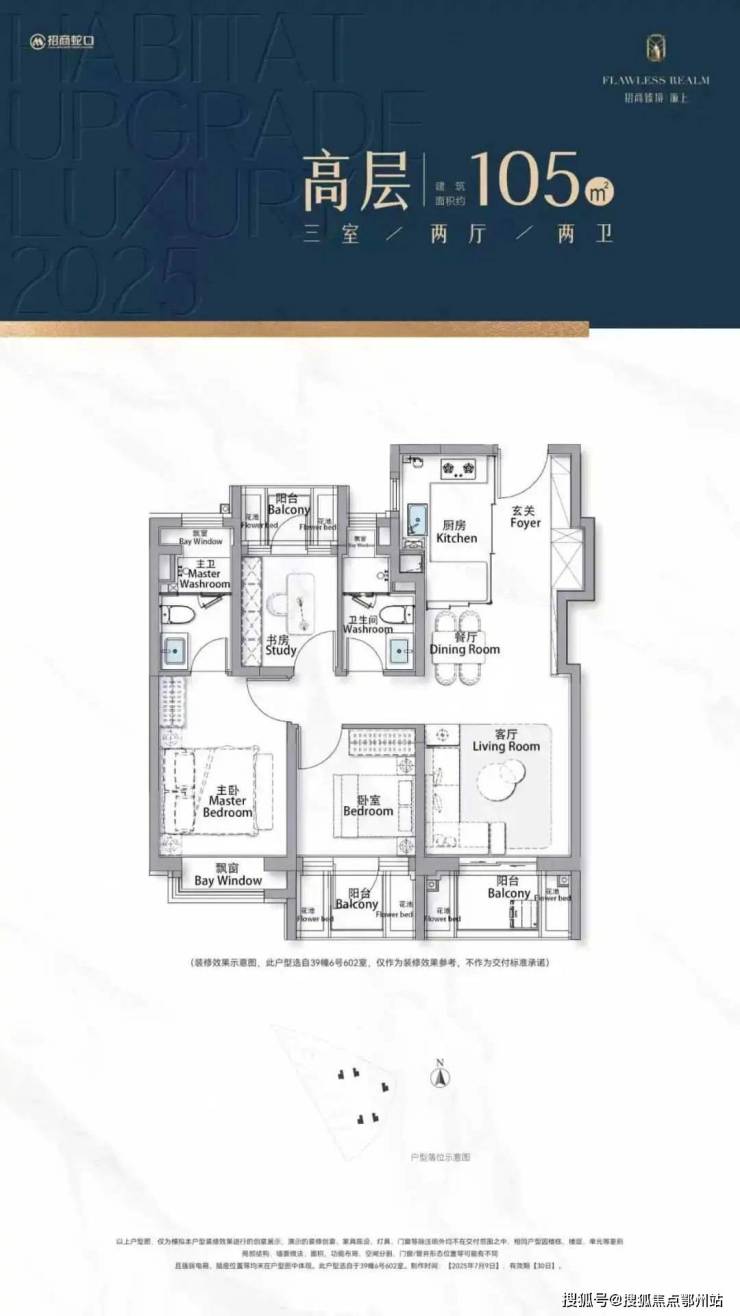 以105㎡的户型为例, “三阳台”搭配花池的设计 ,直接性价比拉满,按照规定: 阳台计一半面积,花池不计面积 ,加上 主卧+卫生间还带飘窗 (主卧飘窗非承重结构),如此算下来,对购房者而言,日常可以实打实 利用到的面积是远超市面上其他三房产品。