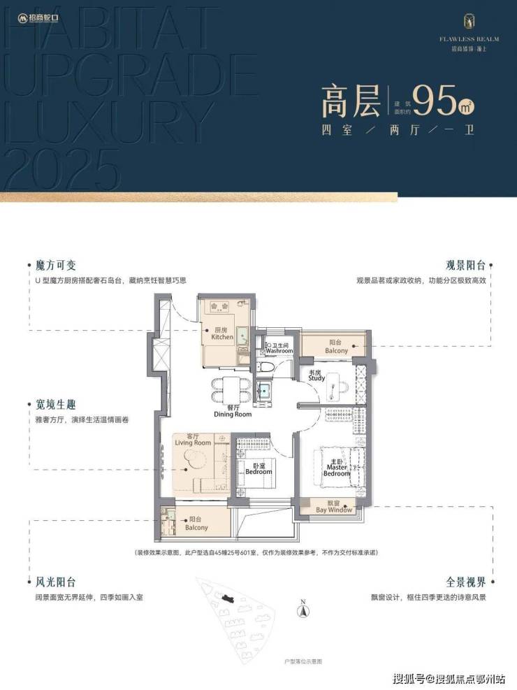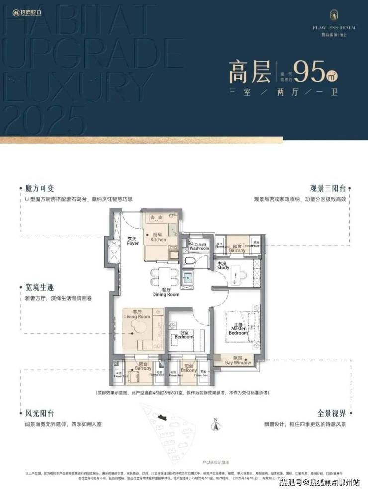 再加上 南向大面宽短进深、全卧飘窗、L型转角阳台设计 ,哪怕小户型95㎡3房,尺度感都超棒,采光和视野更是一流。