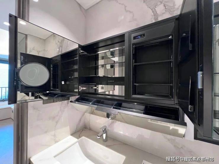 卫生间也同样高标准,五金洁具及淋浴花洒使用德国高仪,主卫无水箱智能马桶、台盆使用科勒,贴心配置女主人最爱的美妆冰箱。