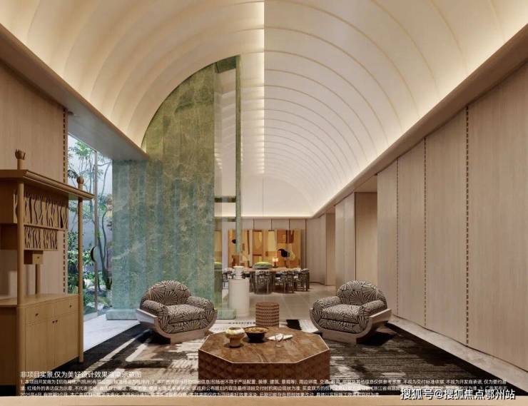 内外双重门厅景墙运用了约1000方顶奢才会用上的 月光米黄石材,还是更费料的弧形石材,搭配香槟金线条,与爱马仕全球旗舰店的双曲面叠墙造景手法如出一辙。