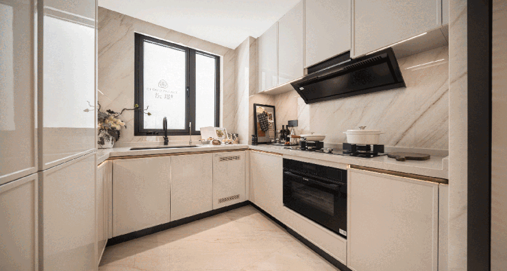 如三大件用的是华宅必备的全屋智能家居,日立两联供的中央空调、地暖,法国爱迪士的新风;厨房用的是博世四件套(燃气灶、吸油烟机、洗碗机、蒸烤一体机),2个东芝嵌入式冰箱,并额外配置3个拉篮;主卧还有日本皇家特供的伊奈智能马桶,沄璟主卫做了杜拉维特双台盆,再铺上威尼斯棕的台面,干净整洁的同时,也有美学视觉体验。