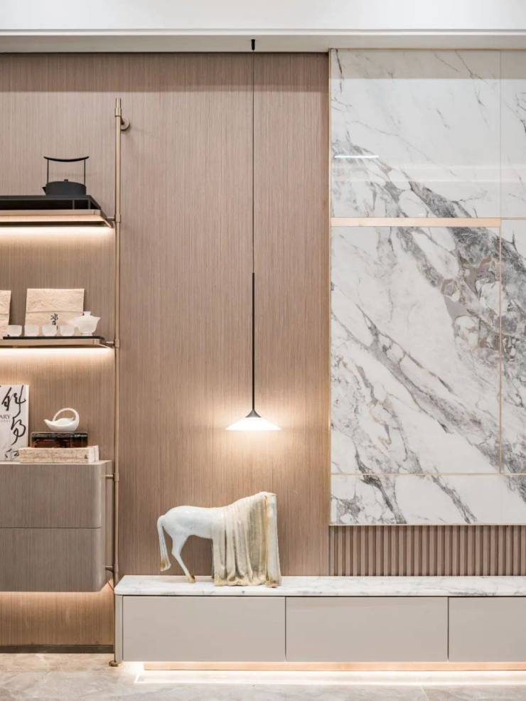 为此项目精选钢木复合门、臻选雅艺壁布、自然木饰面、全景一体化岩板背景墙等精奢材质,搭配充满仪式感的氛围灯带、打磨移门、踢脚线、过门石等每一处细节。 同频全球当代极简审美的艺术美宅呼之欲出!
