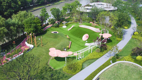 作为稀缺的滨水TOD,光合上城依托自然水系,打造了约20万方的滨水双公园!不同于常规“横向生长”的园林,保利创新性地将公园纵向延伸。打造了 0m上的滨水公园,10m上的体育公园,17m上的社区园林三大主题空间 。