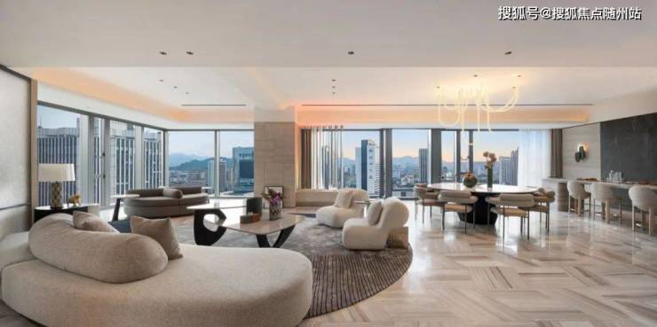另一套约518m²渡边智昭的设计作品,变幻的是风格,不变的是「空间的流动性」。西湖宝石山上的保俶塔,运河边的环球中心,