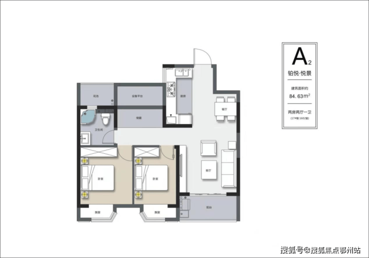 A2户型面积约84.63㎡,全天有采光,视野非常好。整体户型方正,符合国人居住习惯,全明设计,三开间朝南,保证了通风和采光,并且动静分离,也是市场需求最大的3房。约6㎡南向观景阳台,主卧和次卧都是朝南设计,且都有飘窗,入住非常惬意舒适。