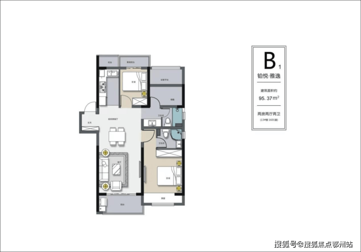 边户B1户型面积95.37㎡,户型方正,南北通透,双开间朝南。进门为玄关设计,增强公共空间的私密性。阔绰南向客厅,局部面宽约3.6米,采光十分通透。此户型最大亮点为南北双阳台的设计,北面增加了一个功能性阳台,可用于放置洗衣机等大型物件,提高了生活舒适度的同时也提升了住宅档次感。