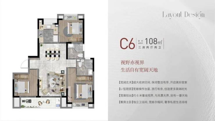 建面约108㎡3房2厅2卫,做到了 三开间朝南+双阳台设计+主卧套房设计+南北通透,该户型得房率非常高。