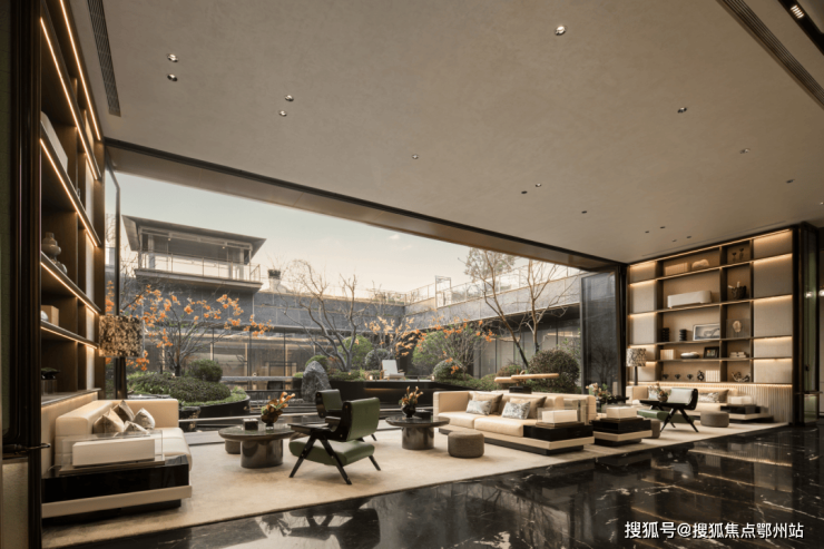 往里走,穿过约200㎡的漂浮感水院,还有以宋式园林为蓝本的下沉式庭院景观,名贵树种、叠石和造型小品,被设计“漂浮”于水景之上,站在一旁的连廊下,一抬头、一转身,都能有不一样的景致。