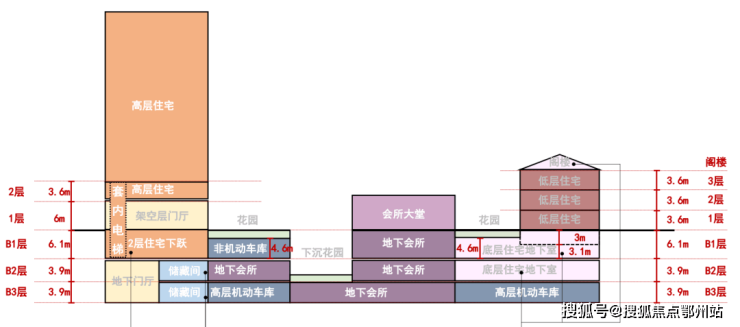 北区的四幢75-100米的高层住宅,层数为20F、24F和27F。南区仅一幢地标150米的超高层住宅,设计层数41F。