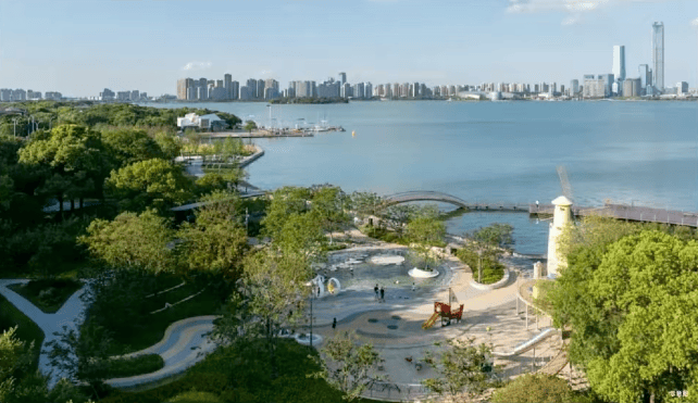国际先进公园住区:向城市让渡一些开放空间, 以前街后河、约12000m滨水公园 (代建)等一体化柔性边界,打造「外揽城市绿肺,内藏森境天地」公园住区,让繁华都市与静谧生活自然过渡。