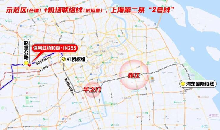 而示范区线(在建) 左手长三角一体化、华为,右手前湾、大虹桥总部商办 , 并通过虹桥枢纽,串联2号线及正在试运营的机场联络线, 把市中心、徐汇、闵行、张江等高能板块都纳入保利虹桥和颂·IN255的通勤版图。
