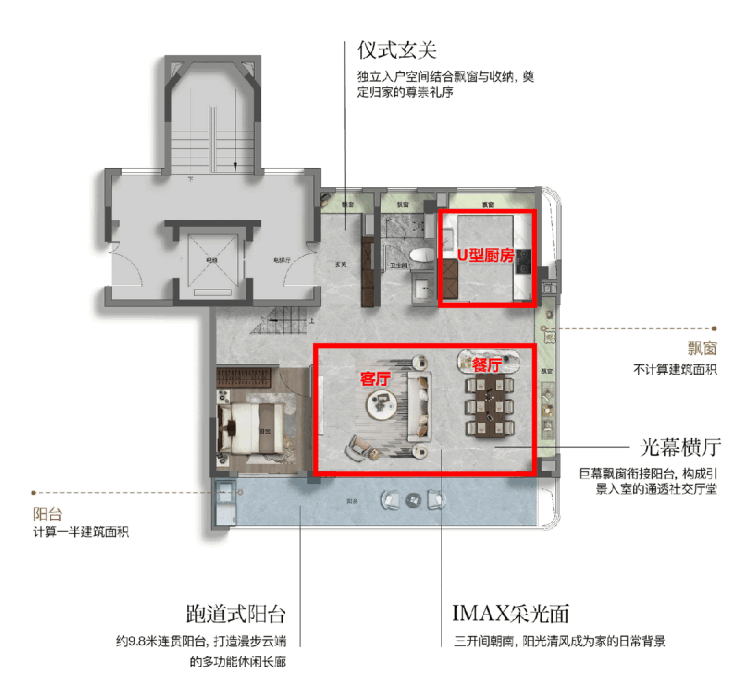 在细节打磨上,此户型亦不遗余力。 全屋飘窗全赠送约9.8㎡,配合约7.2㎡的大阳台(计一半建筑面积) 不仅增加了实际使用面积,更在视觉上提升了空间的通透感。