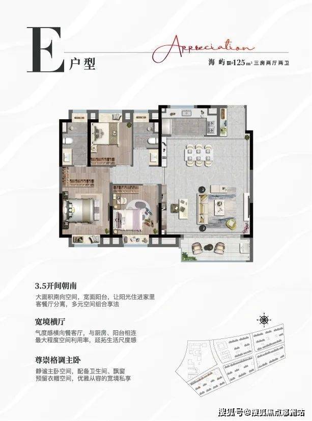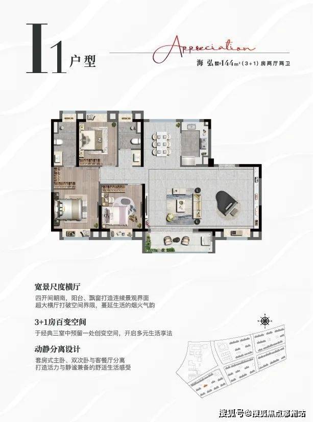 户型 面积范围 梯户比 总价区间 特点 三居室 100-125㎡ 一梯两户 305万起 三开间朝南,精装交付 四居室 144㎡ 一梯两户 约440万 270°飘窗观海,3+1灵动空间