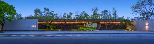 金地提倡“家的品质,从社区的入口开始”,在西门出入口,有雅致气派的门廊,走进来有仪式感较强的山水意韵景墙,材料上石材与金属相碰撞,相得益彰。