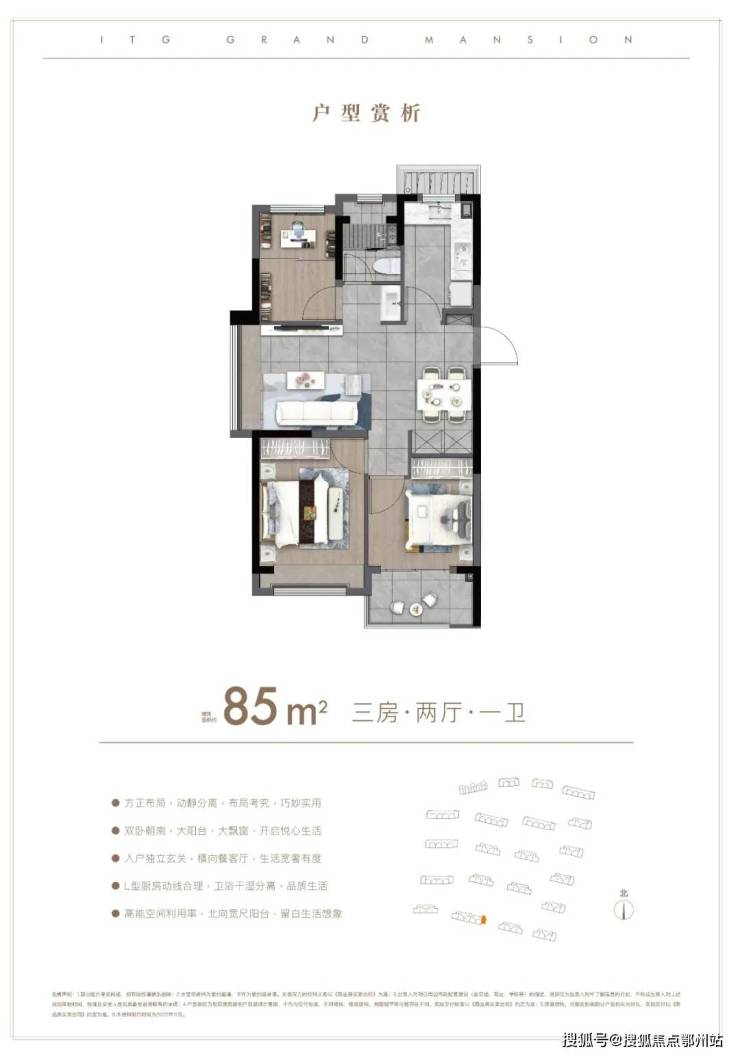 约85㎡三房的创新设计令人眼前一亮,三开间朝南且带有双飘窗,尽管是小户型,但功能性与舒适度兼备,使居住空间更加惬意。