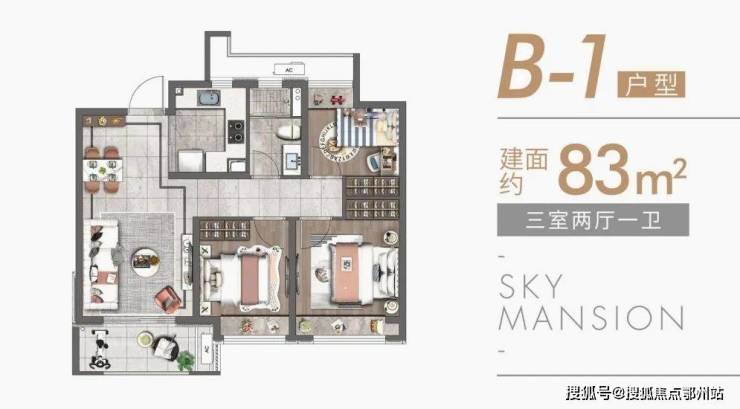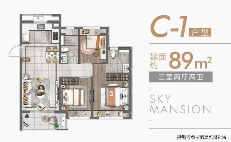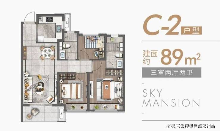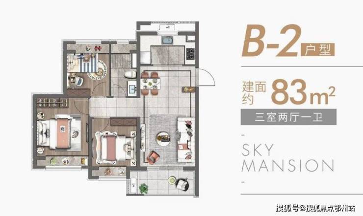 上海宝山天铂建面约83~89㎡朗阔三居全能户型,动静分离,静谧舒适,每1cm的考究,都映射着每一个人居的诉求