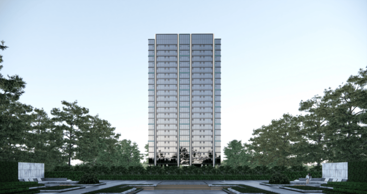 沿着售楼处的花园轴往里走,已经可以看到部分楼栋的外立面了。叠加外立面天青色釉面陶板为主,高层外立面则是天青色铝板+玻璃幕墙,边套还有L型大飘窗。