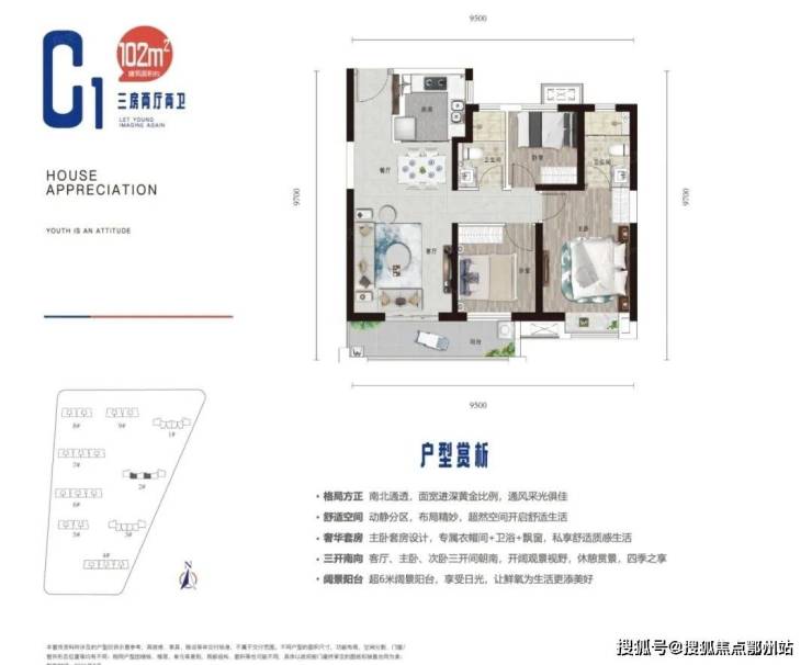 C1户型建面约102㎡,三房两厅两卫:该户型三开间朝南,南向大阳台连接客厅和次卧,采光比较好,主卧南北贯通,有独立卫生间,居住舒适度高。