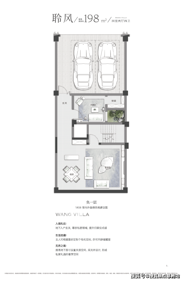 同时, 地下室也做到约5.5米的奢阔层高,南侧采光井引入室外阳光,规避了南方别墅地下室阴暗不通风的弊端,打造了舒适敞亮的全明地下室,后期也适合业主根据自己的爱好规划地下室空间。