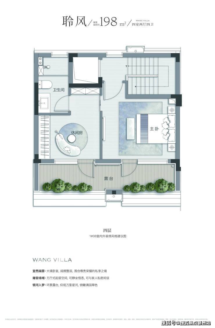 四楼超大套房主卧,彰显一家之主的身份和地位,是男女主人的私享天地,拥有步入式衣帽间、全明无暗卫浴、阔景星空露台。阅尽繁华后,也能时刻享受居家舒适。