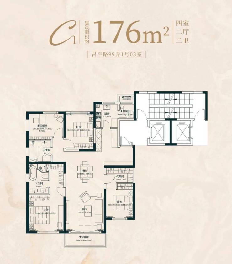 建面约176㎡4房2厅2卫户型: