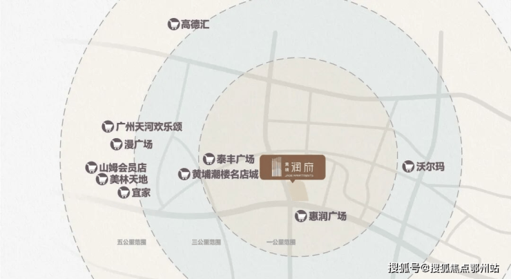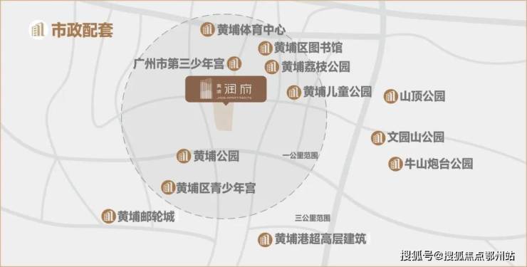 北面一路之隔是原黄埔区政府,直线约600米到保利中央公馆、黄埔体育馆;东面是万科城市之光,它就是位于惠润广场正对面的新溪旧改。