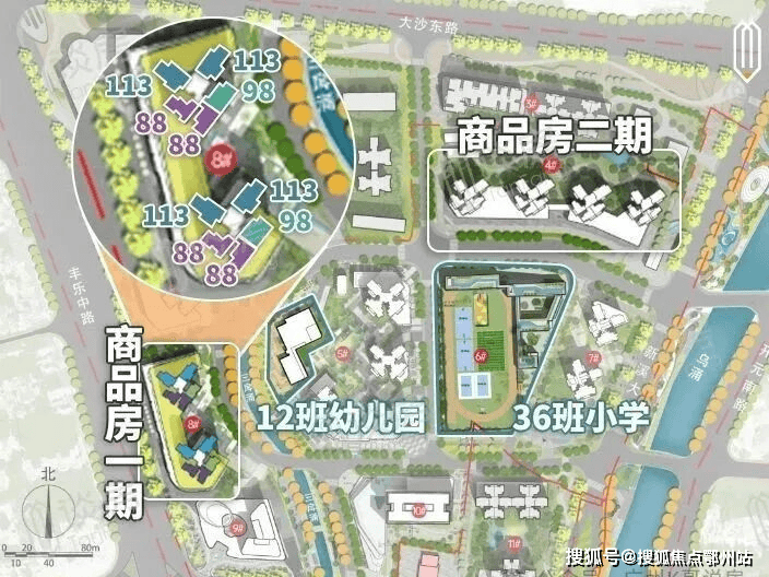 自身配建一所12班幼儿园,一所36班小学,初中依靠周边现有配套。