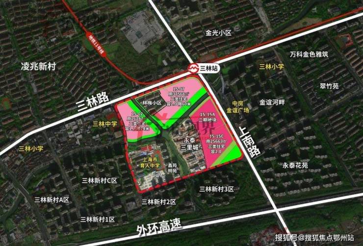 该地块为三林镇金光村“城中村”改造的重点项目,紧邻地铁11号线三林站, 规划一条12米宽公共步行通道,连接社区与地铁站;同时周边有中房金谊广场、三林中学、东方医院等生活配套。