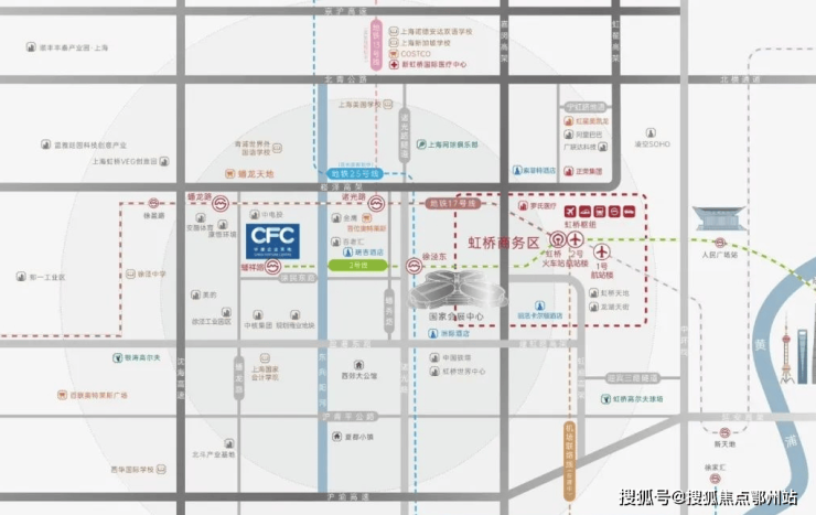 中建企业天地位于国家会展中心西侧约1.2公里处,且处于2号线国家会展中心站再往西延伸一站的潘祥路地铁站正上盖(在建),其一期项目又距离17号线蟠龙路站直线约800米处,项目北侧740米处即为崧泽高架的入口,交通出行相当便利。