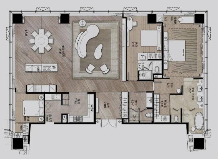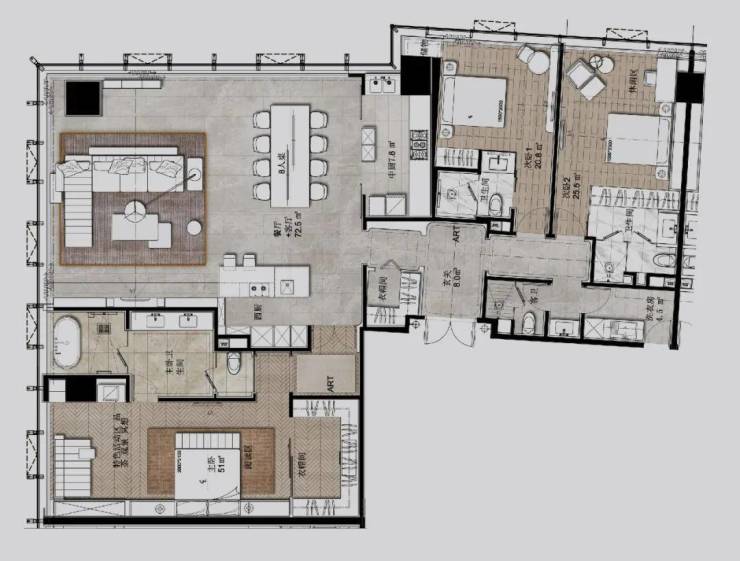 诚邀知名设计师戴鹏原创奢阔大平层空间,在限量席位的空间规划中,将生活形态和美学意识转换为尊贵身份的注解。
