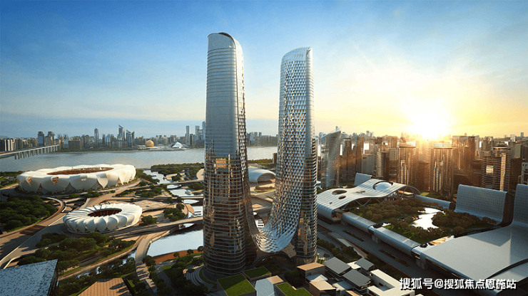 项目由2幢高约310米的塔楼和商业部分组成。2幢塔楼建成后将作为奥体板块地标性建筑之一,