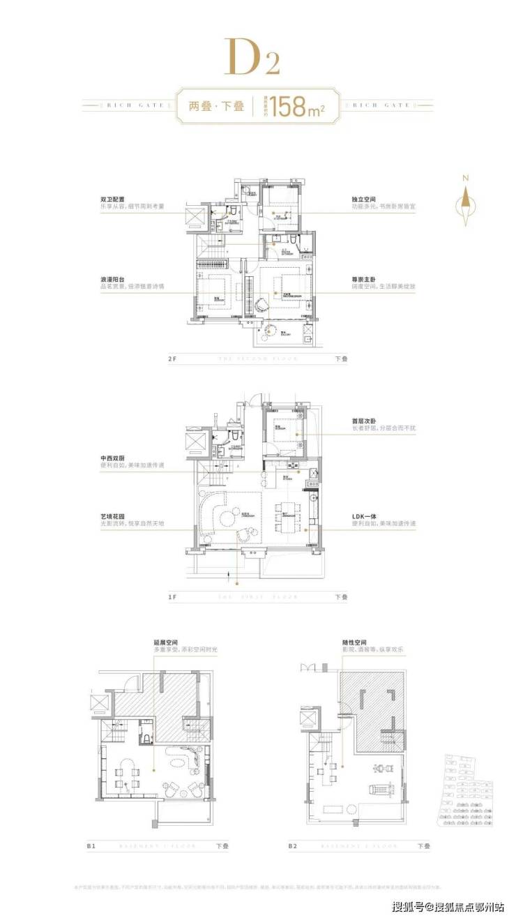 更重要的,项目的两叠产品拥有着 媲美联排的丰富灵动空间,上叠和下叠都配备地下室,且均为双层格局的地下室空间。下叠南花园,北面入户花园;上叠北花园,露台,坡屋顶空间。