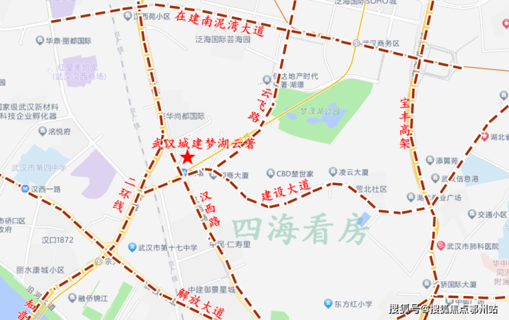 武汉城建梦湖云著位于建设大道与汉西路交汇处,楼市板块属于武汉CBD板块,行政划分属于硚口区,二环以内。