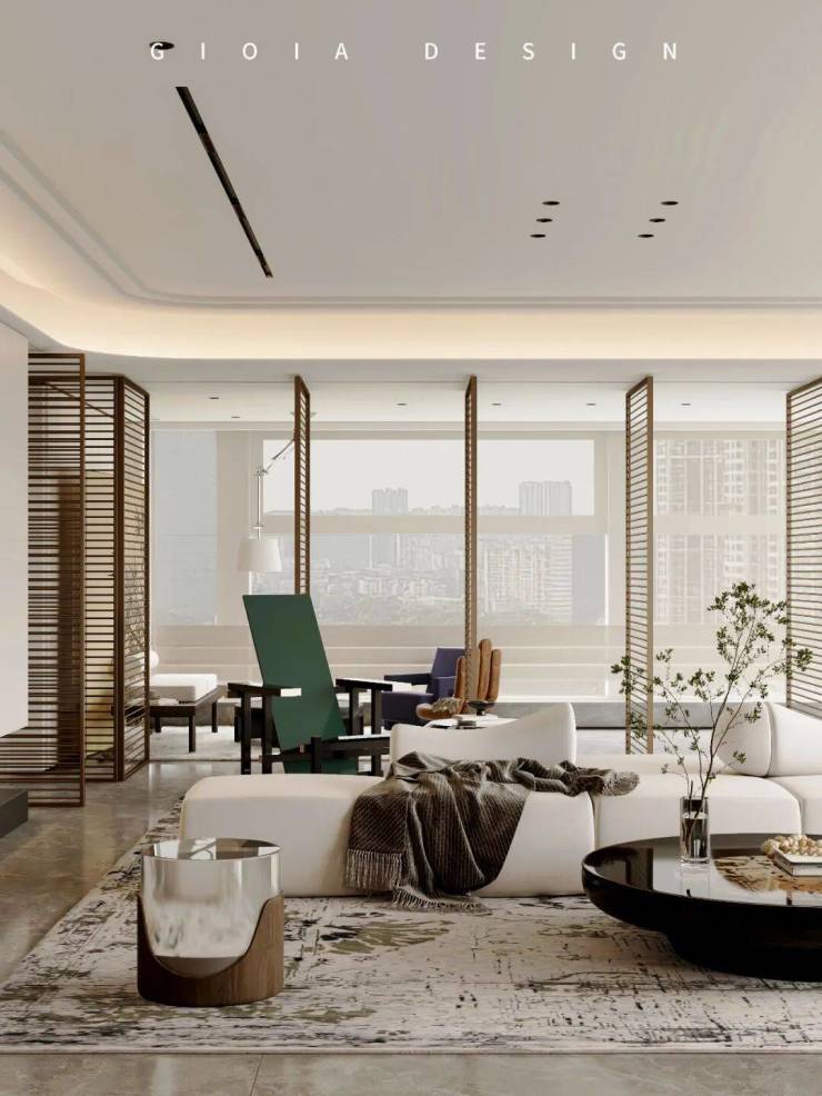 将艺术感进一步融入日常中。特别设计的专属门厅空间,是从电梯厅延伸到家,如同一处艺廊,放慢人的情绪;室内选用了 浅金色奢石(外界也称其为“芬迪白大理石”)作为主要的石材,曲面的木饰面也为浅色,整体给人以明亮感。
