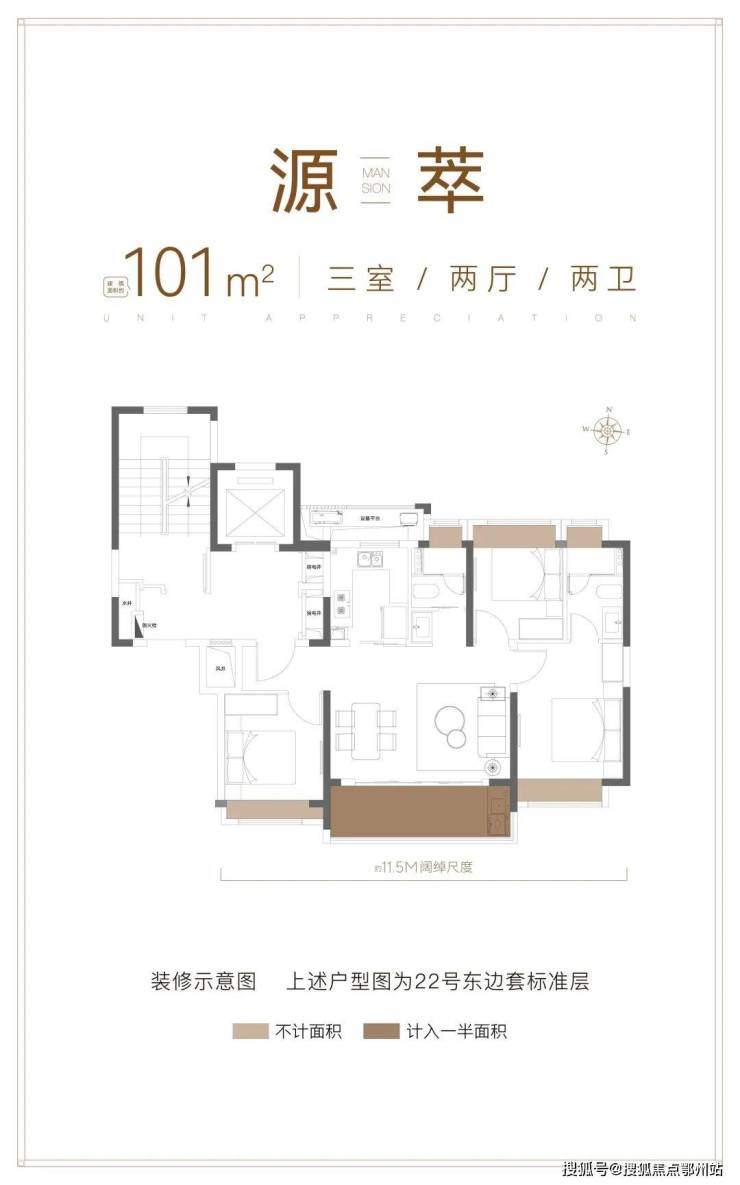 建面约101㎡3房2卫户型,非常 标准的飞机户型。三开间朝南整体 约11.5米的面宽,客厅面宽更是做到了约5.3米的舒阔尺度!