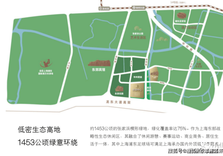 东郊国宾馆,南为张江科学城,北为金桥产业园、碧云国际社区,东为东郊中心.