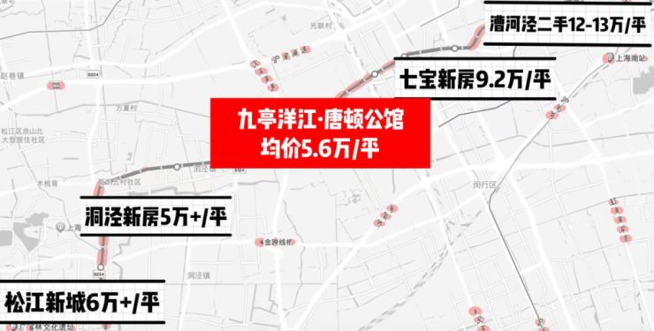 其次,放眼全 上海均价“5”字头 的板块 ,目前只有 洞泾、泗泾,川沙、周浦、航头、新场、曹路等 比较偏僻的板块,要么距离轨交远,要么周边城市界面不成熟。实在是让人难以下手!