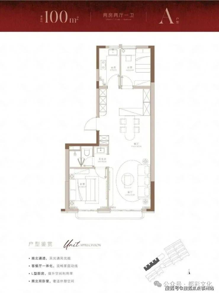 建面约100m²大2房户型,带来的不仅是方正的布局,也为购房者带来了体验感超绝的视野和采光。