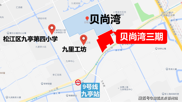 项目南至沪松公路,西为沪亭北路,北侧为涞寅路,东至新漕泾河,与九城湖滨、奥园接壤,三期是目前距离9号线九亭站最近的住宅地块。