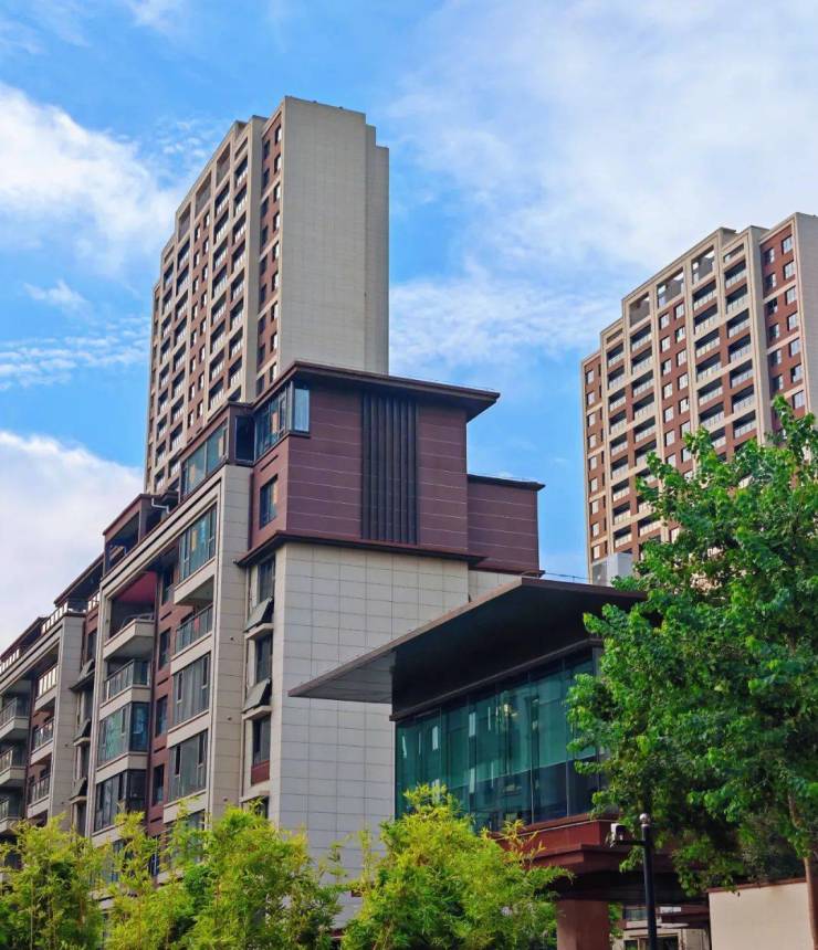 立面上: 新中式风格建筑, 极具辨识度,加上大面积的玻璃窗在阳光照射下更璀璨夺目、高贵典雅。