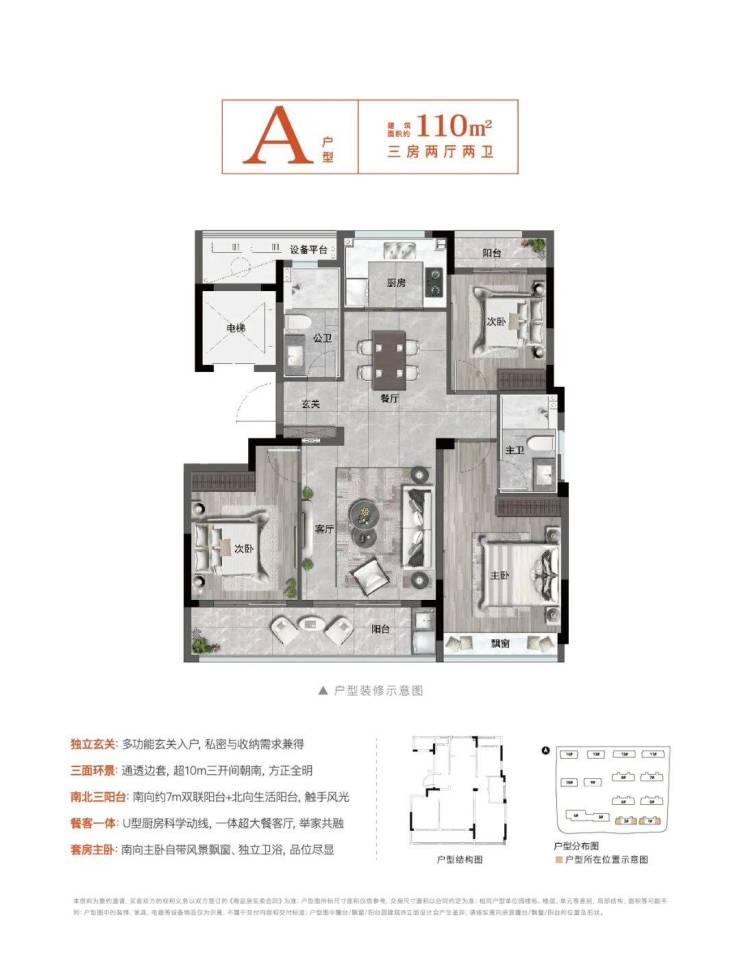 约110㎡户型点评:独立玄关:多功能玄关入户私密与收纳需求兼得,三面环景:通透边套,超10m三开间朝南,方正全明,南北三阳台:南向约7双联阳台+北向生活阳台,触手风光,餐客一体:U型厨房科学动线,一体超大餐客厅,举家共融,套房主卧:南向主卧自带风景飘窗、独立卫浴,品位尽显