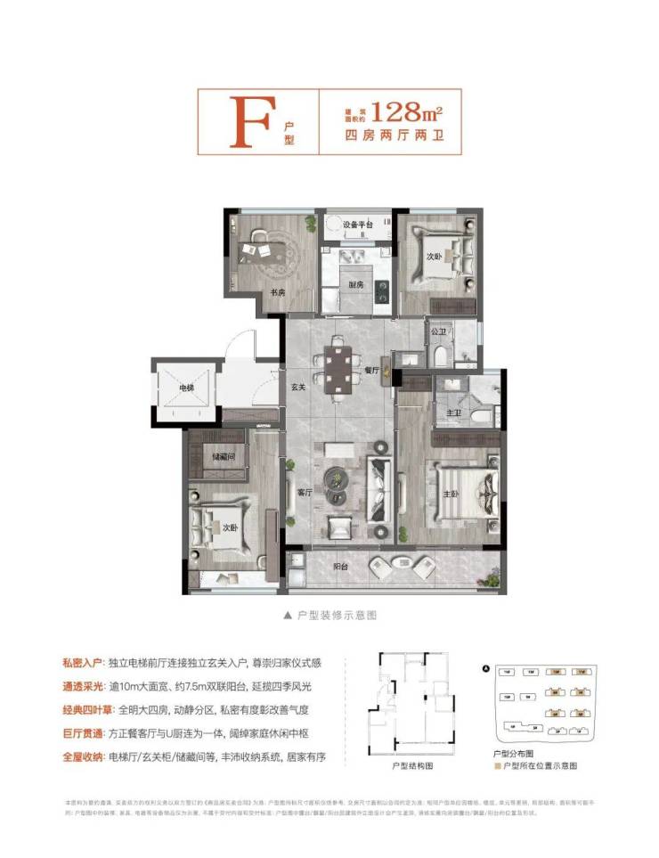 约135㎡户型点评:独立门厅:独立电梯前厅连接独立玄关入户尽显归家礼仪风尚,经典四叶草:奢阔大四房,分散式布局,私密有度彰大宅气度,尊崇双套房:南向卧皆配独立卫浴,同面积段产品,板块祗此,迭代三卫:创领超配设计,隐私主卫,体面客卫,定义富春新改善,环幕通透:三面采光,方正格局,约7.5m巨幕阳台盛载阳光