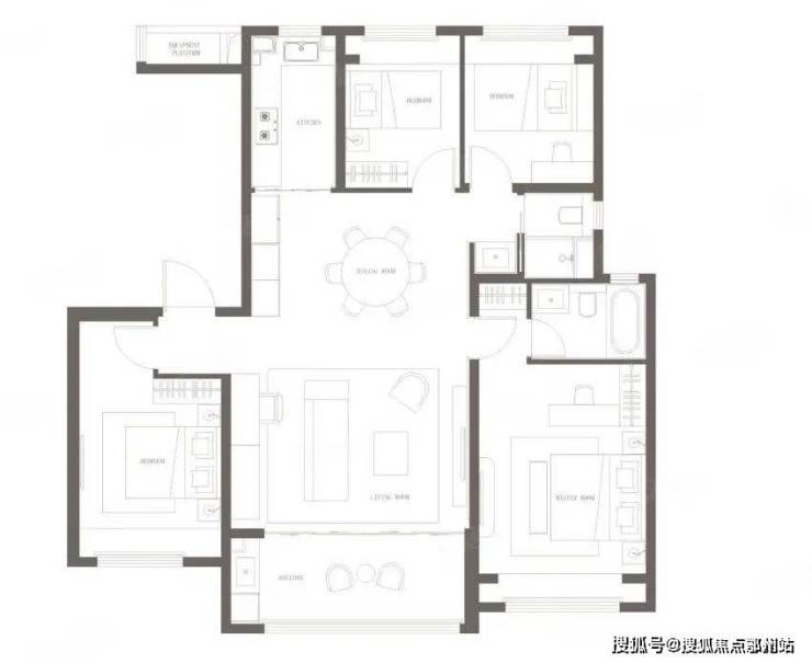142㎡户型采用了LDKB一体化布局,经典的四叶草户型,小横厅户型,阳台约5.2米,缺点是南北进深较大,餐厅采光有影响。