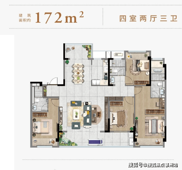 建面约 172㎡四房两厅三卫:在 143㎡户型基础上升级,客厅进一步拉大,配备敞开式书房,塑造阔绰横厅,双套房设计,适合三代同堂。