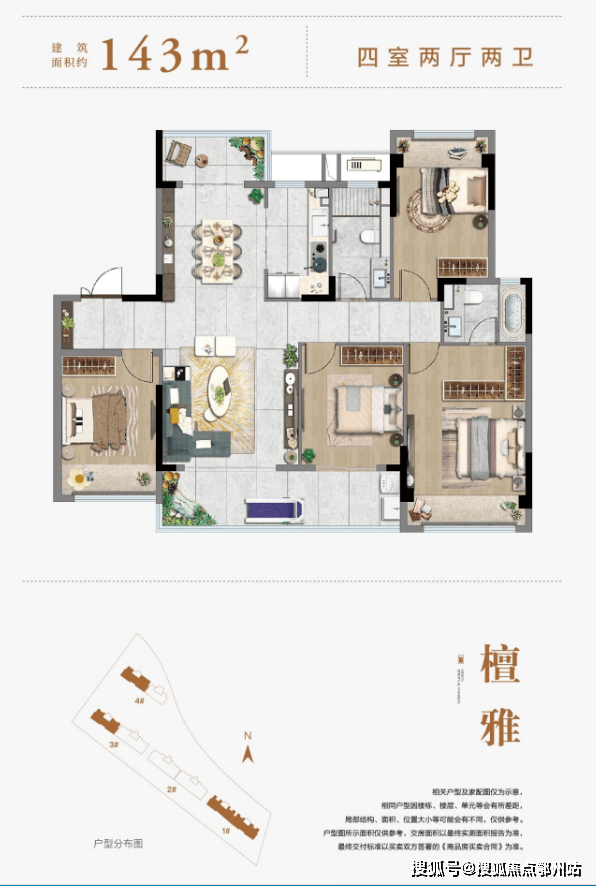 建面约 143㎡四房两厅两卫:四开间朝南格局方正,客厅、餐厅、南北双阳台一体化设计,空间充裕,生活动线流畅,主卧套房设计,独立卫浴注重尊崇私密。