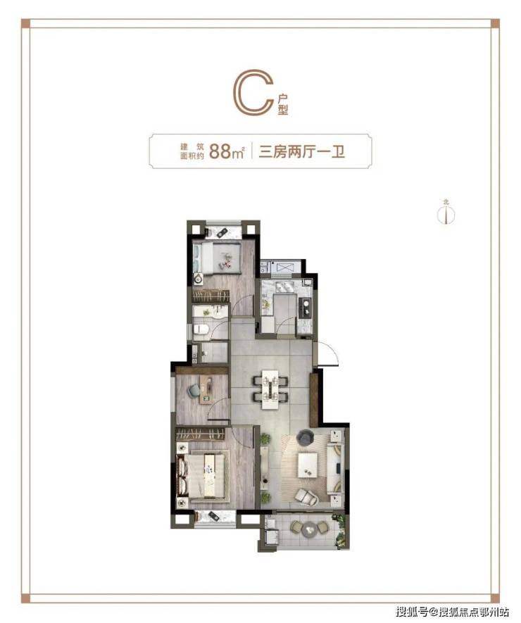 预算相对有限的,可以选这个建面约88㎡3房: